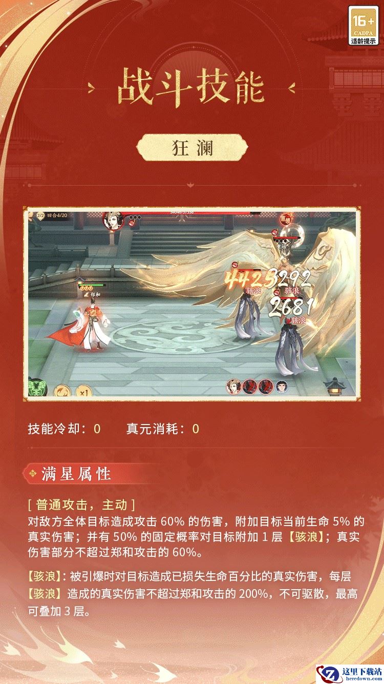 [骇浪]:被引爆时对目标造成已损失生命百分比的真实伤害,每层[骇浪]造成的真实伤害不超过郑和攻击的200%,不可驱散,最高可叠加3层。