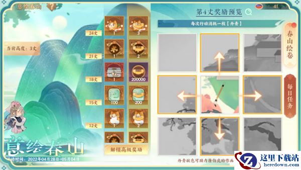 1、使君需要指引唐伯虎在右区九宫格上行路,访山探景,绘取春山,获取奖励。