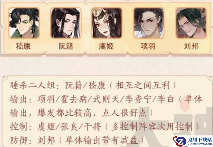 嵇康阮籍睡杀二人组,两个人都有的话一定要搭配着用,他们的输出和控制效果可以发挥到极致, 目前嵇康打pvp效果可以。不推荐搭配群体输出,不推荐打副本,关卡BOSS。