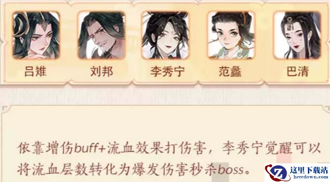 吕雉的特点是附加流血状态,但仅凭她一人想要追加其高层数的流血状态是有困难的,需要队友的协助。可以考虑同样可以附加流血状态的队友, 也可以考虑能够给予吕雉新回合的队友。