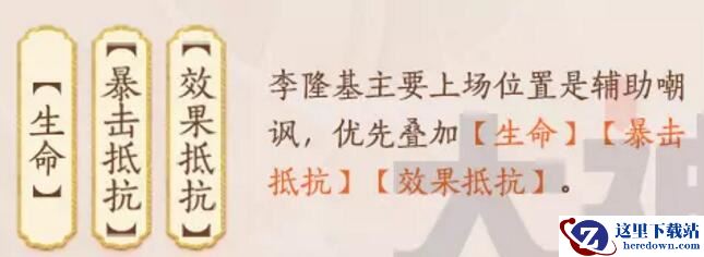 高渐离,李隆基特性技能使目标获得最高10%效果抵抗。
