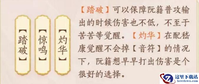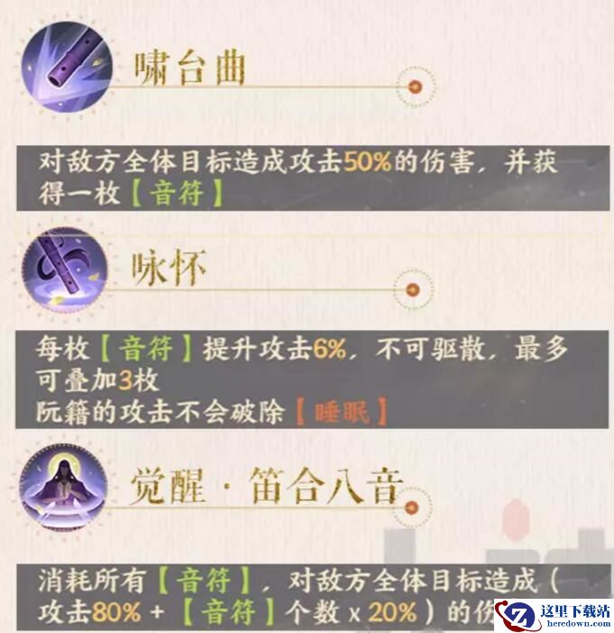 嵇康,阮籍[普攻.啸台曲]伤害增加5%,[ 觉醒●笛合八音]不再消耗音符。