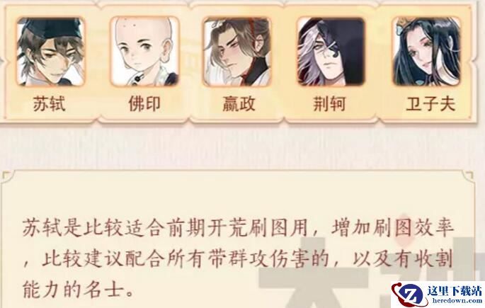 苏轼作为前期送的地卡,在没有其他名士的时候可以拿来作为刷图工具,群体伤害不低,并且配合上佛印能降低敌方攻击,能输出能治疗,比较全能。比较适合前期开荒,效率较高。