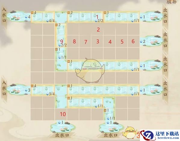 3、在2、7、8、10的位置放置水量承载为1的直道。