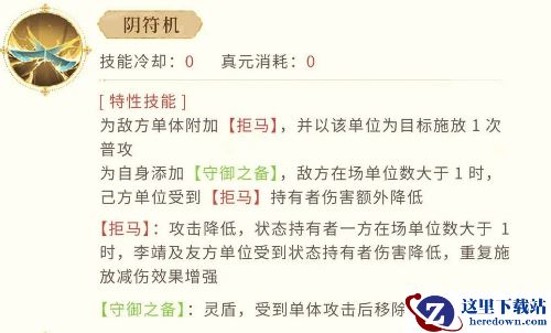 说到【拒马】,这可不只是李靖用来单纯攻击敌人的工具,它还是他整个战斗策略的核心之一。李靖的“阴符机”技能会为敌方附加【拒马】状态,简单来说就是让敌人的攻击力减弱。与此同时,他还能够为自己加上【守御之备】,为自己披上了坚固的防御盾牌,这个盾牌会在受到单体攻击时移除,但有一个关键点——如果敌人有不止一个单位存在,【拒马】的减伤效果就会越来越强。这就意味着,李靖的防守不仅仅是单一的盾牌,而是一个层层递进的防御网,越是敌人数量多,李靖和队友的保护就越强。