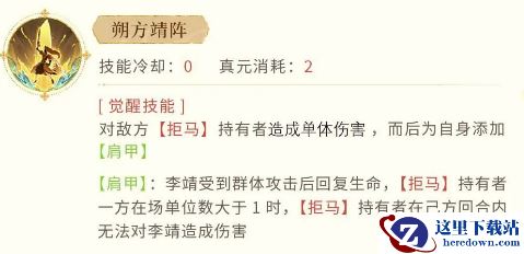 当局势变得更加复杂时,李靖的觉醒技能【朔方靖阵】便展现出了他无与伦比的控制力。在敌人持有【拒马】的情况下,李靖会施放强力的单体攻击,并为自己添加【肩甲】。这个【肩甲】真实的效果是:李靖在受到群体攻击时,会有生命恢复的效果。而且,如果敌人持有【拒马】的单位数量超过1,李靖还会在己方回合内使敌人无法对自己造成伤害。这种技能不仅大幅度提升了李靖的生存能力,还能有效牵制敌人的攻击节奏,配合队友打出反击的机会。