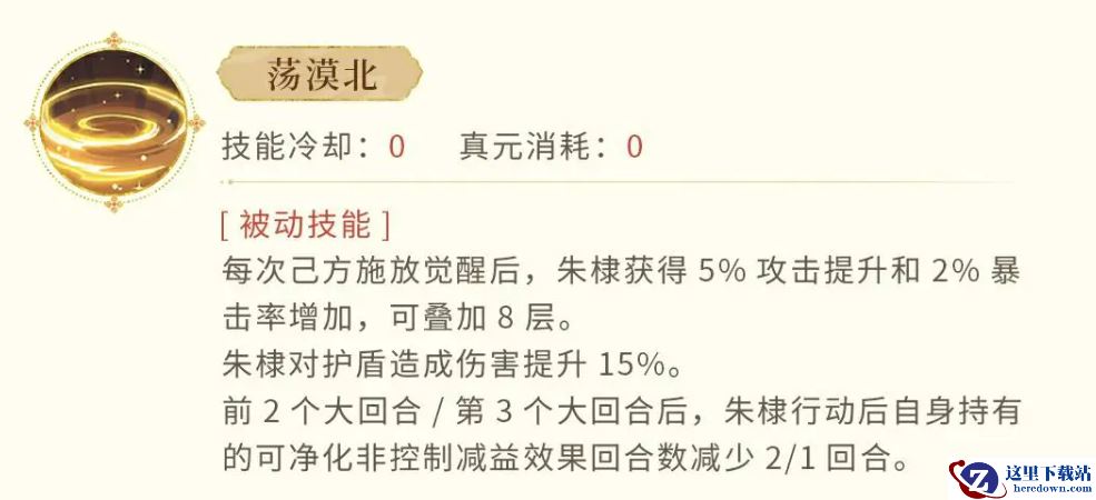 这项技能的被动效果是朱棣的杀手锏。每次你的队友发动觉醒技能后,朱棣就能获得5%的攻击提升以及2%的暴击率加成。最爽的是,效果可以叠加,最多达到8层!如果你在每回合都能激活觉醒技能,朱棣的战斗力将变得异常恐怖。不仅如此,朱棣对护盾目标的伤害还能提高15%,这让他在对抗带有护盾的敌人时,能够发挥出极强的优势。