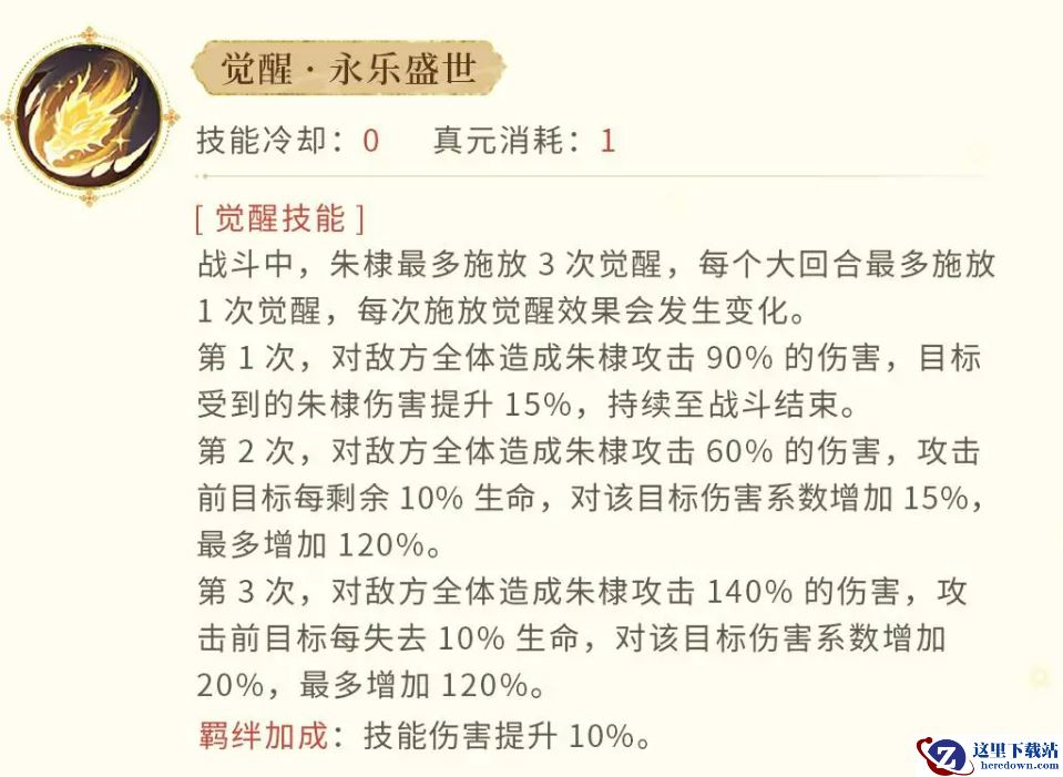 说到朱棣的觉醒技能,那可真是不得不提的亮点。每一轮觉醒技能的释放,都能在不同阶段大幅度提升朱棣的输出,简直是让敌人感受到他压倒性的力量。第一次觉醒,会对敌全体造成攻击90%的伤害,并使敌人受到的伤害提高15%,持续到战斗结束。也就是说,朱棣每一次觉醒,都会让敌人更加脆弱,直接为下一轮的输出做足准备。第二次觉醒则会对敌全体造成攻击60%的伤害,这时,目标每剩余10%的生命,朱棣的伤害系数会增加15%。换句话说,敌人生命越低,朱棣打出的伤害就越高。简直是专治高血量敌人,放大了朱棣的爆发力。第三次觉醒是最惊人的一击。朱棣对敌全体造成攻击140%的伤害,且随着敌人血量的下降,朱棣的伤害会进一步增加,最多能达到120%的增幅。简直就是让敌人后悔站在他面前。除此之外,朱棣的羁绊加成还能让他的技能伤害提升10%,让他的觉醒技能更加致命。