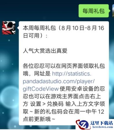 登录微信公众号,进入后在输入框输入【每周礼包】即可弹出当周礼包码!