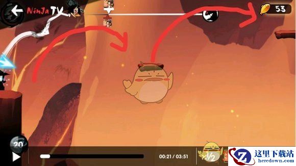 传送门结束来到上方第一块长板,这里需要通过左键下落后跳回来避免伤害的同时吃到金鱼币,一共两次,大概在箭头处下落时机最好。