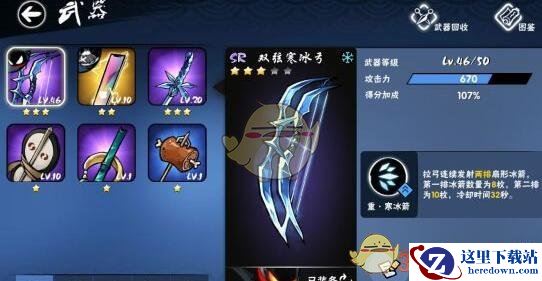这把武器的外观非常炫酷,蓝色的冰晶外观非常引人注目,攻击力和分数加成也是相当高,46级就有670的攻击力和107%的分数加成,技能方面也是很强力,向前方射箭,每排都有很多箭矢,是个非常强力的技能,主要是得分和攻击高。