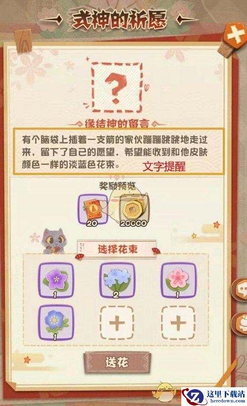 2、在委托中选择“正确的花束”送给小妖怪,即可完成委托,并获得加速道具/剧本/金币等等奖励,“正确的花束”会有文字提示供家主推测,若不正确仍可以继续赠送,但消耗的花束不返还。