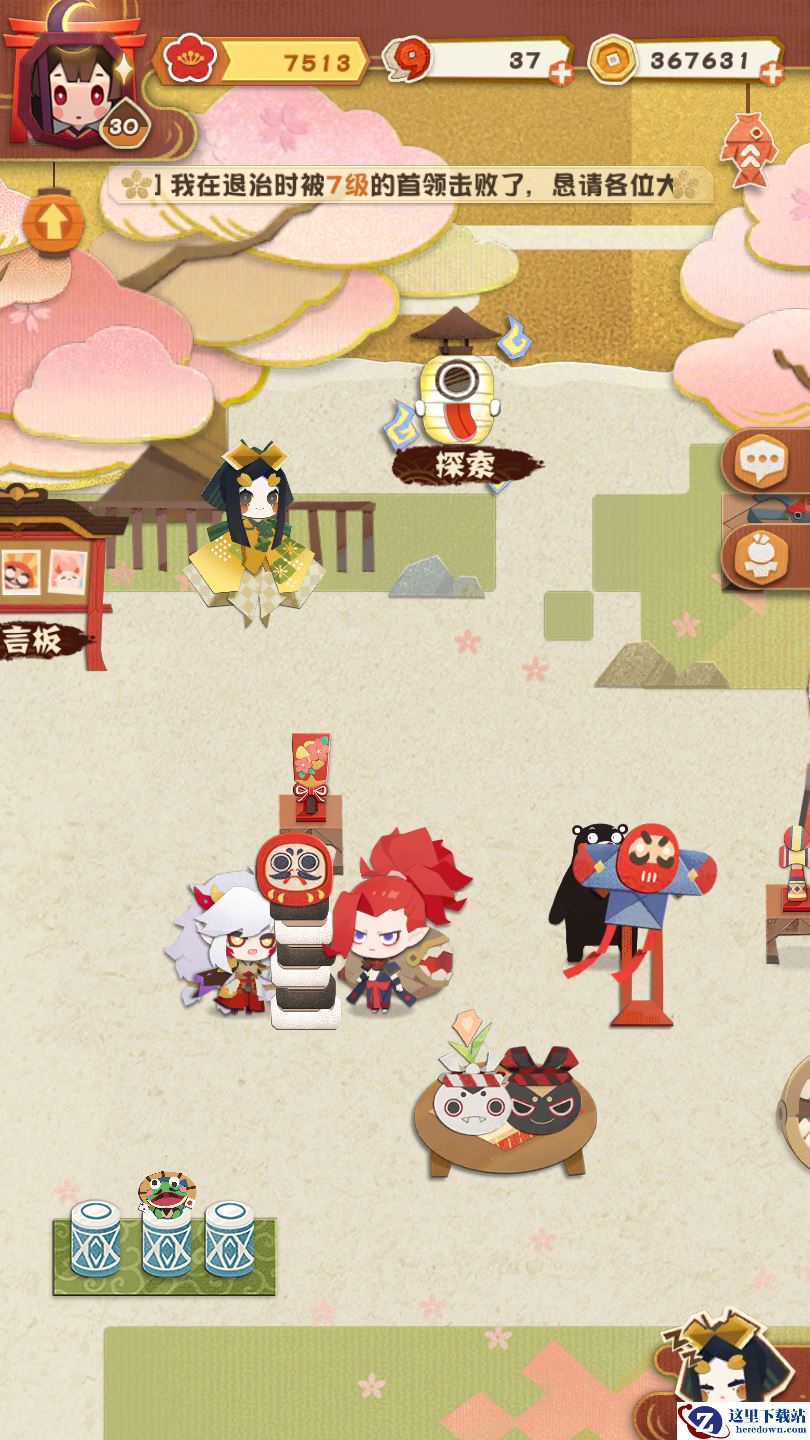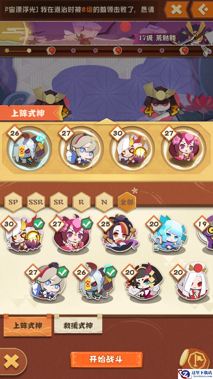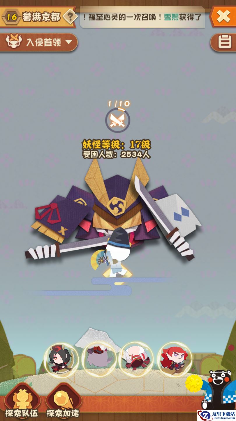 在庭院中点击探索按钮后,就可以进入到探索地图,在这里可以看到当前正在为非作歹的妖怪,点击开始退治后进入战斗界面。