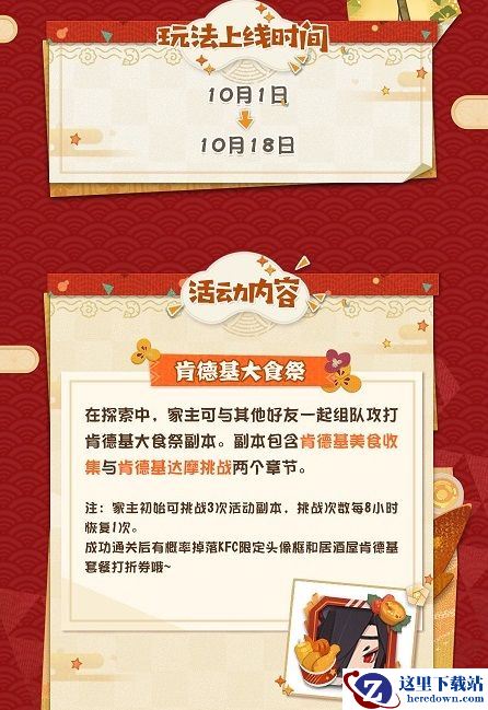 活动期间,在探索中家主可与其他好友一起组队攻打肯德基大食祭副本。成功通关后有概率掉落KFC限定头像框以及居酒屋套餐打折券哦~