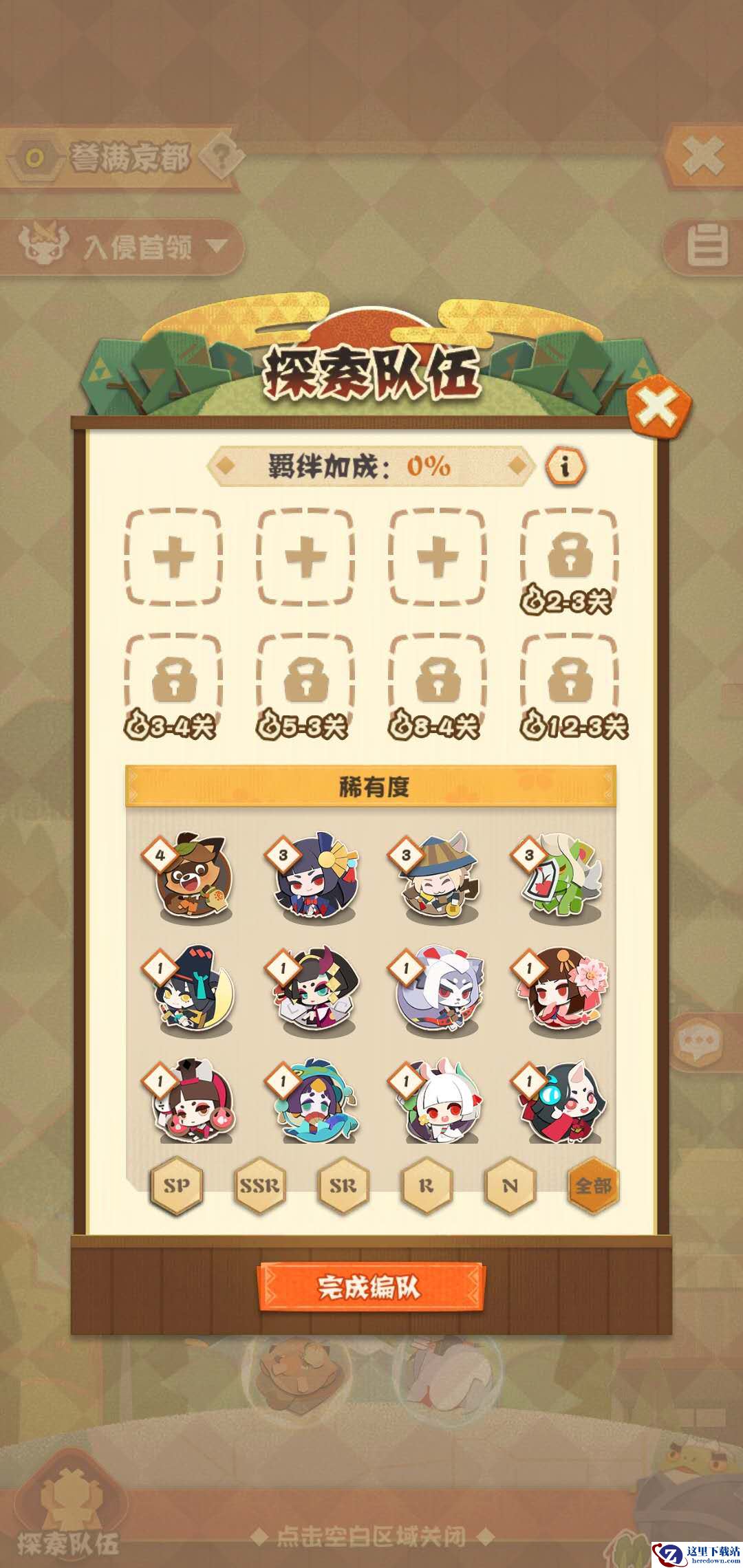 食材由式神挂机探索获取,点击庭院中的探索进入野外探索界面,在开始探索之前我们需要编排好探索阵容。探索队伍最多容纳8位式神,式神位置数量会随着通关关卡逐步解锁,通关12-3后全部解锁。