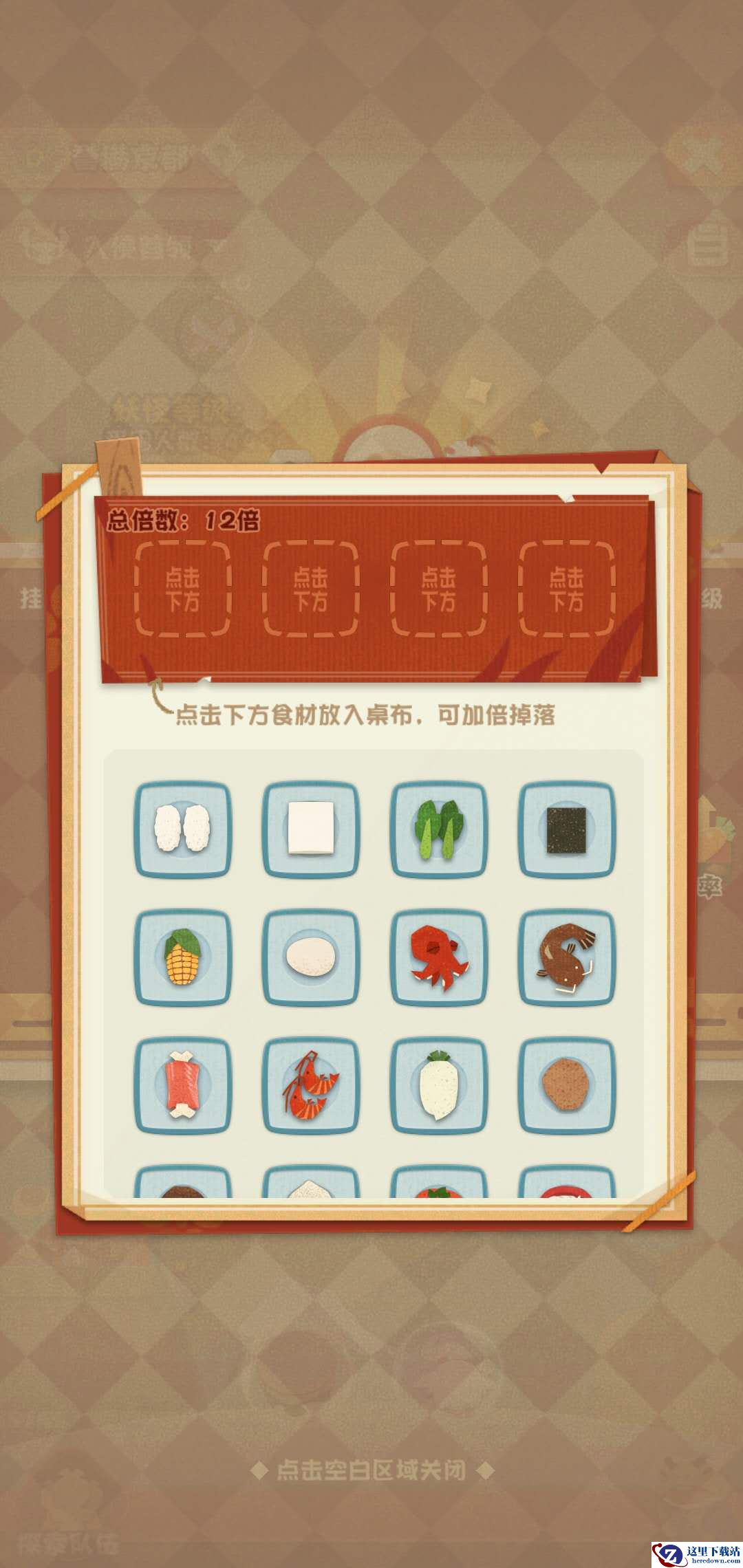 10、食材是随机获取的,如果想要提升某种食材的倍率,我们可以在收取战斗收益的界面点击食材倍率按键,选择特定食材放入桌布,即可提升掉落几率。