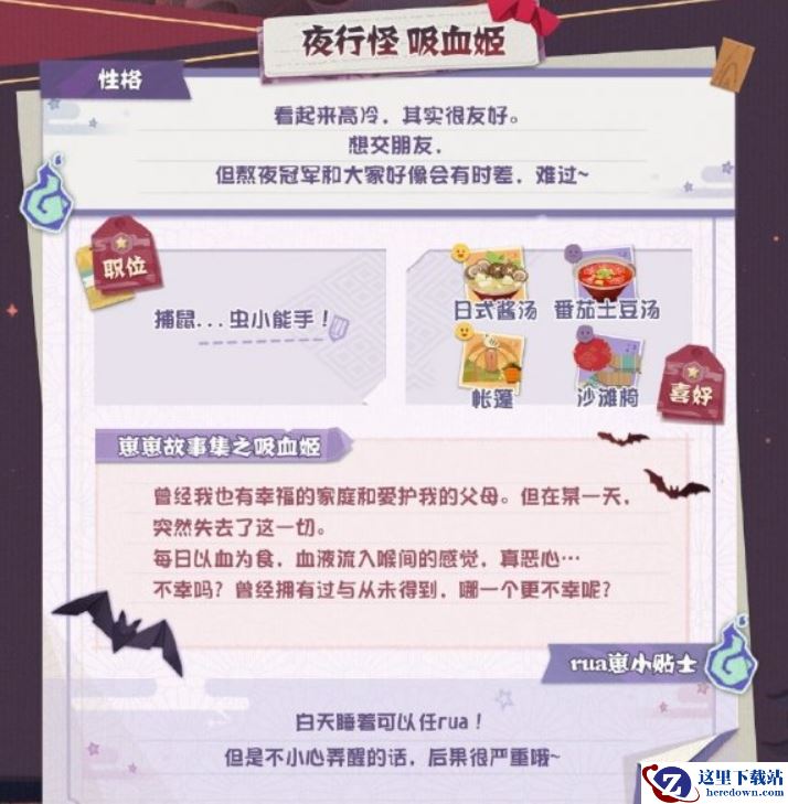 看似高冷的她却有一段不幸的过往,“曾经拥有过与从未得到,哪一个更不幸呢?”实际效果请以游戏内为准虽然吸血姬曾遭遇不幸,但相信来到妖怪屋后,她能在庭院里重新感受到家的温暖!
