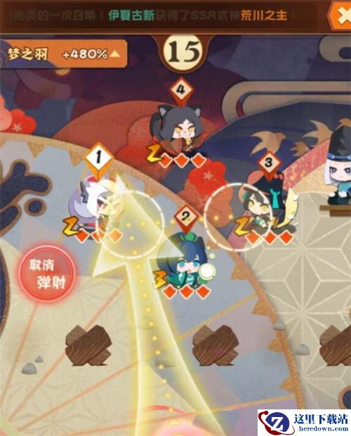 4、椒图一定要注意,就放在图中那个位置,偏左一点会打不到中间或者右边的怪,偏右一点会在上面来回弹,导致敌方队形拉扯改变。控制落点的蓝色圈圈虚线距离怪头顶的大招回合数标志1毫米左右,拿捏准,就会形成这样。