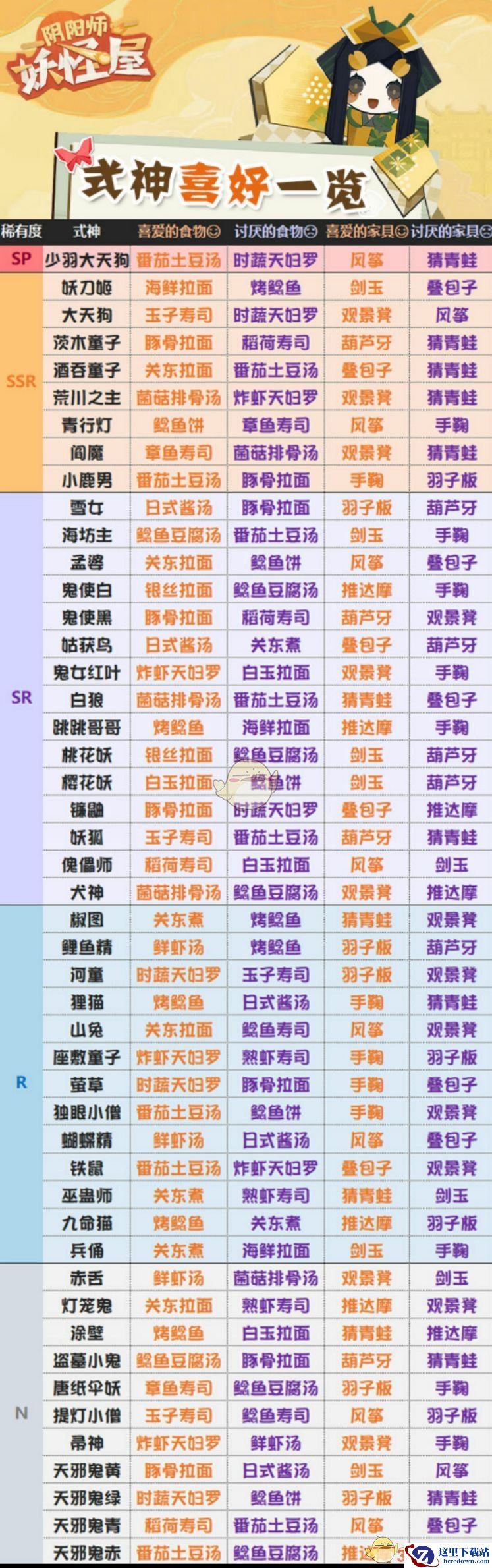 以上就是小编整理的关于《阴阳师:妖怪屋》全式神喜好大全的全部内容,更多游戏攻略请持续关注这里下载站!