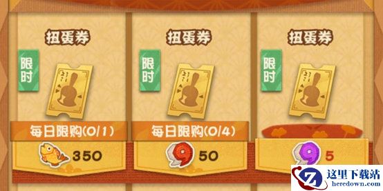 家主每次扭蛋将消耗一张「扭蛋券」,然后可获得随机颜色扭蛋与一枚「扭蛋币」。