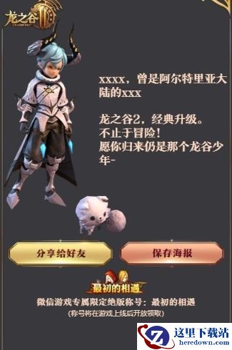4、选择完成之后,点击生成海报,就能获得刚刚创建的海报和游戏专属的限定绝版称号——最初的相遇
