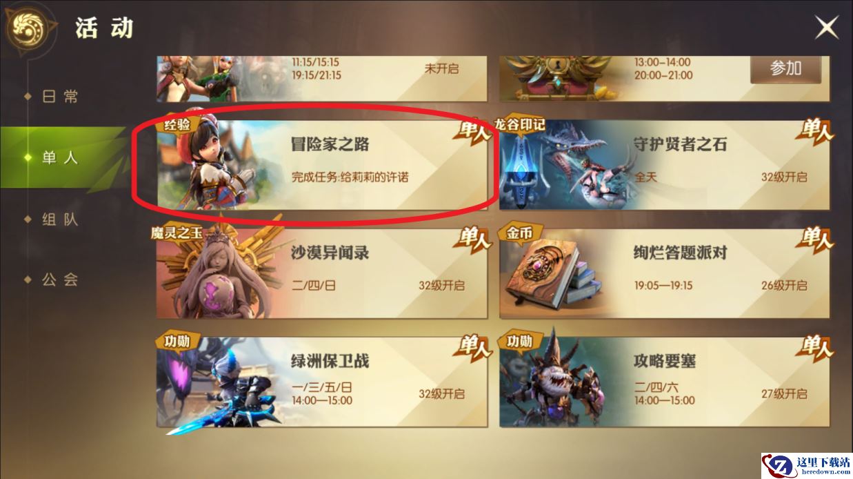 我们在活动中选择“冒险家之路”,完成相应的任务就能获得大量的经验,但是每天只能完成3次哦。