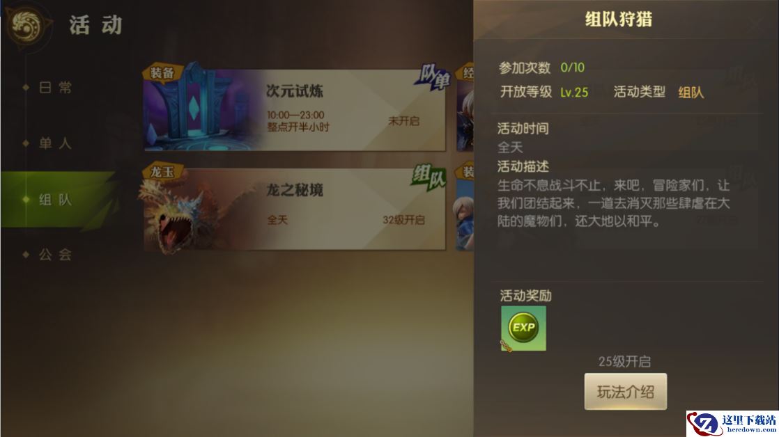 在活动中点击“组队狩猎”,组队完成狩猎任务,就能获得大量经验奖励。