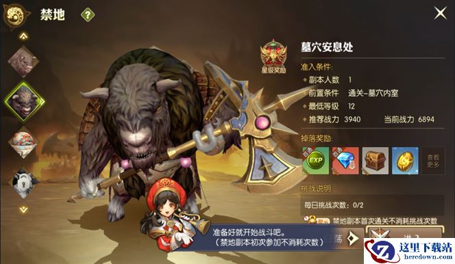 1、点击游戏界面右上角“副本”图标,点击“禁地”,我们要根据自身战斗力等级情况选择合适的副本地图。