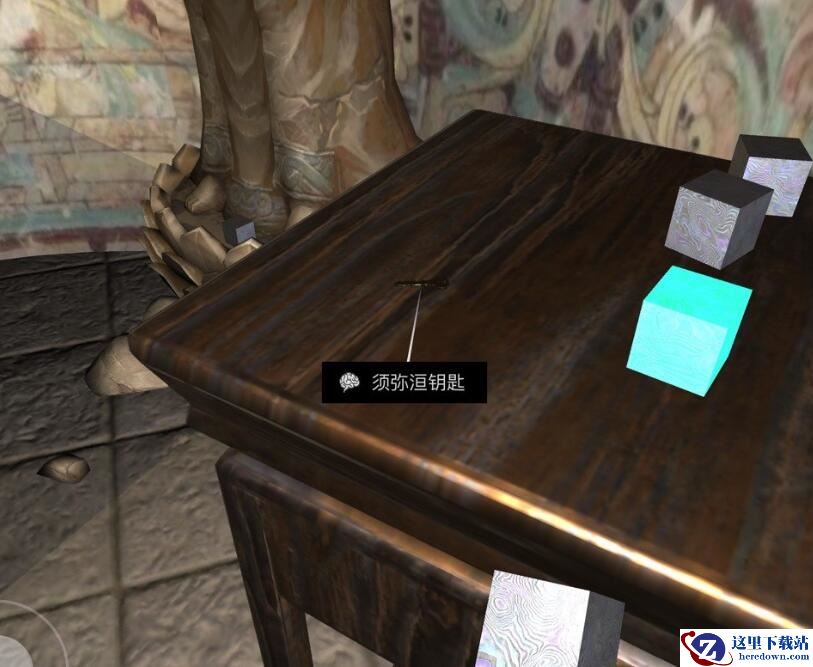 须弥洹钥匙:索位于铁块里面,当再次点击铁块的时候,铁块有一面是有字的,根据佛教五戒,选择“语酒淫杀盗”,打开获得钥匙。