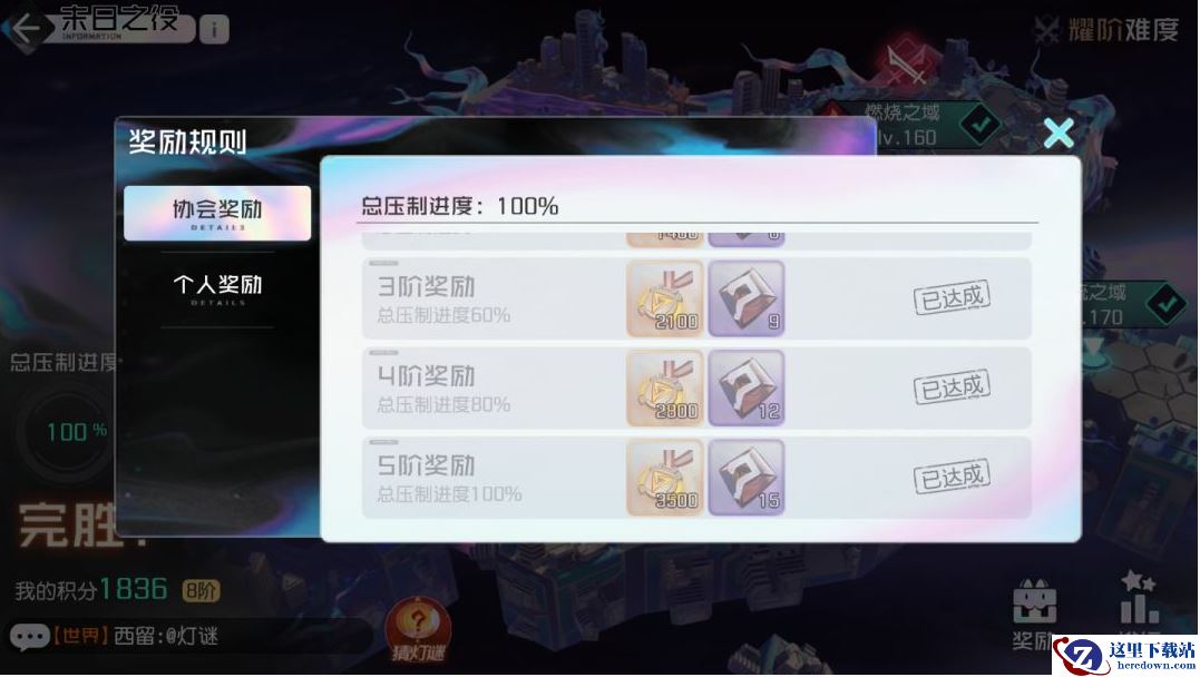 根据不同个人积分以及协会压制进度获得不同的奖励。