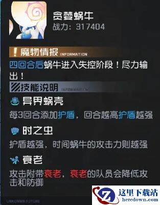 大家可以看到boss有三个机制,简单点来说就是随着回合数的提高,蜗牛的护盾和攻击力会越来越高,而且还会给予我方攻击和防御的debuff,但是因为围剿作战是有回合限制的,所以总的来说boss能够叠加的攻击和护盾还是在可承受的范围之内的~(ps:所以当时放到主线里还是让不少玩家卡了~)