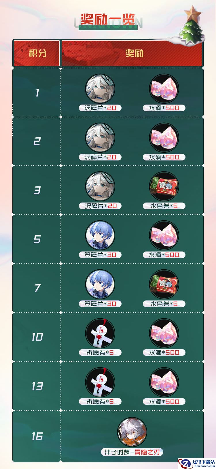 积累积分可以获得水滴、角色碎片(活动中累计获得的碎片,将可以合成完整的笠*1、沢*1)、双旦限定券(水色券)等奖励。