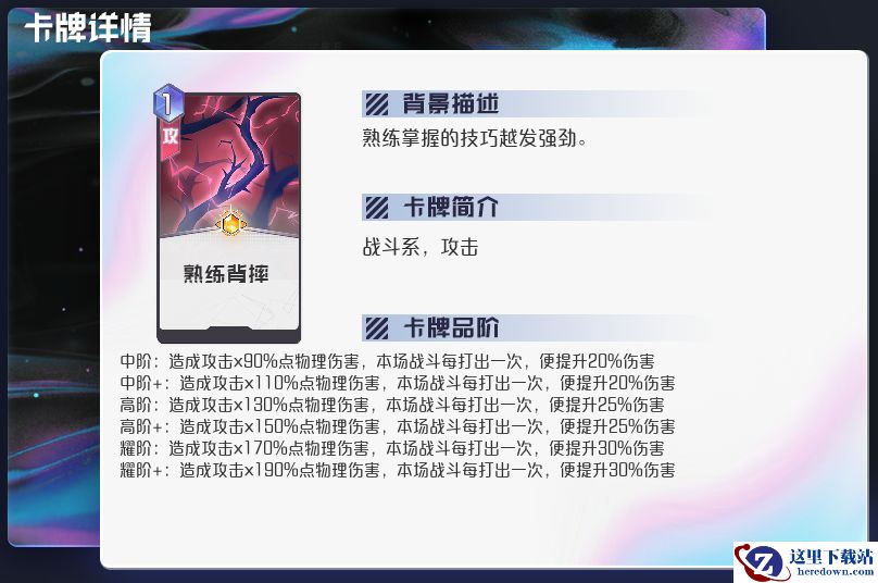这个流派思路在于反复打出熟练背摔这张卡——每一次打出这张卡的伤害会永久提升,当打出的次数足够多以后,一卡几十万伤害也不是不可以实现。