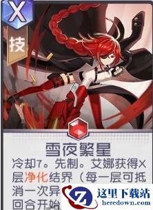 技能三:冷却7。先制。艾娜获得X层净化结界( 每一层可抵消一次异常状态)。我方回合开始时,如果艾娜有净化结界,抽一张牌。