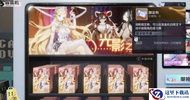 消耗限定券,可以在盲盒机的限定卡池中抽取角色或卡牌。