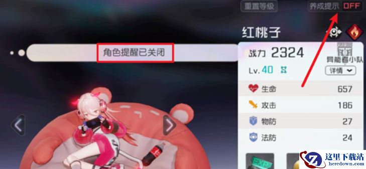 4、在养成界面中,点击右上角的“养成提示将ON改成OFF,就会显示角色提醒已关闭。