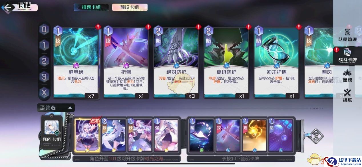 1、由于卡组是由三位角色的卡牌共同组成,所以前期多使用辅助角色卡牌,可以保证下几轮提高我们获得攻击角色卡牌的概率,从而可以使出终极技能在单回合内直接带走对面,这种玩法在游戏内还是极为重要的。
