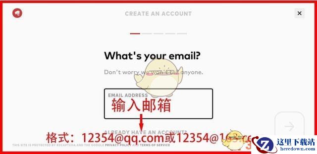 2、填写你要注册的邮箱,任意邮箱即可,只要能收到邮件就行,例如网易邮箱12345@163.com或谷歌12345@gmail.com或QQ邮箱123456@qq.com。(这里推荐使用QQ邮箱,如: 12345@qq.com)