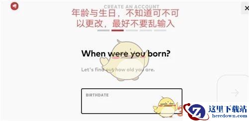 3、这一步主要是填写注册账号的出生日期,建议填一个自己可以记得住的,方便之后改密码或者找回账户,接着点右下角的红色"→",进入下一步。(最好选择2000年以前的,以免被当做未成年)