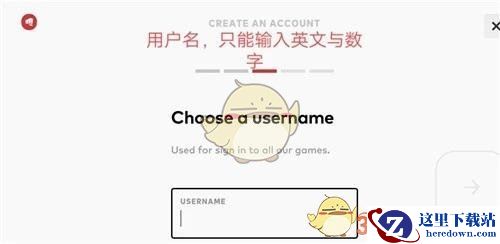 4、这一步设置的是自己的昵称,以后登陆游戏都是使用的这个账户,自己一定要记住(英文与数字,共8位)。