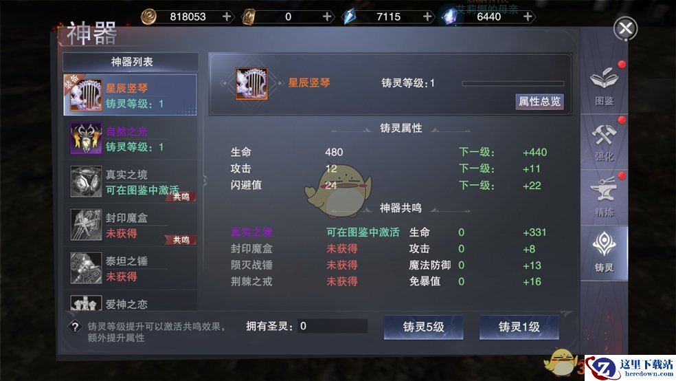 铸灵等级下方显示所选神器的铸灵属性,左侧为当前属性和数值,右侧为下一级增加属性数值。再下方为共鸣神器显示区域,显示和所选神器共鸣的神器,当共鸣的2个神器铸灵属性都达到5级是激活共鸣等级和对应的属性,属性值右侧显示下级共鸣等级增加的共鸣数值。