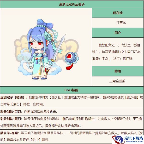 4、戳目珠·夺明:彩云仙子掏出法宝·戳目珠施法,一段时间后戳目珠光耀照射前方敌人,使敌人陷入【失明】异常状态并降低【命中】属性。