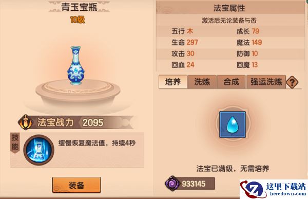 2、青玉宝瓶:必备木属性,第一阶段时全程携带,第一阶段较笨,基本不掉血。如果实在是掉血过多就不必使用瓶子