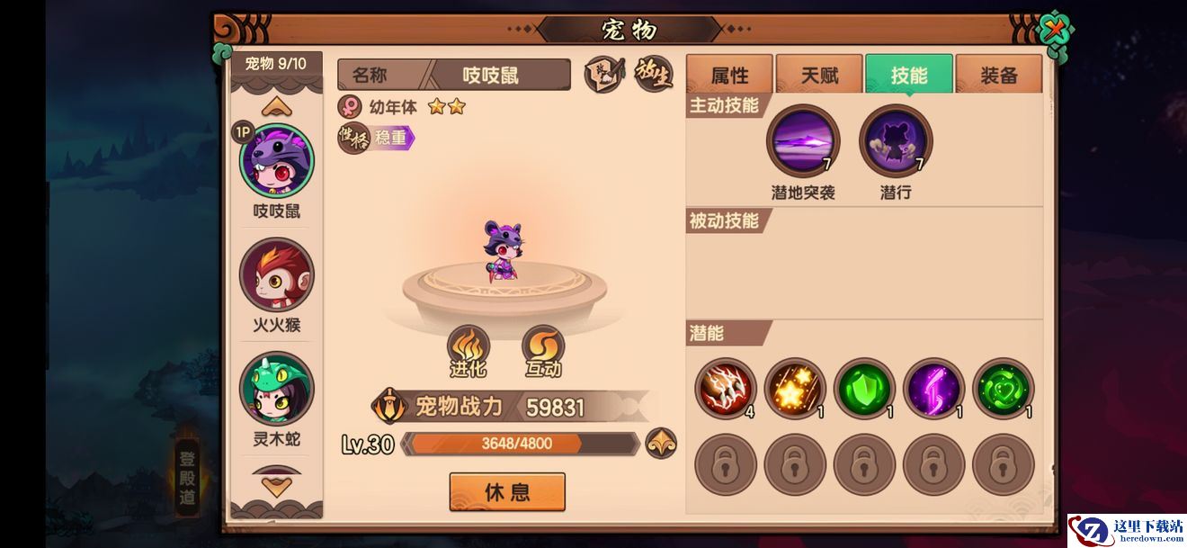 吱吱鼠和灵木蛇,首推灵木蛇,因为蛇在这个版本的属性加持甚至比刷了暴击的老师还强,并且蛇非常肉伤害也不低,可以在打boss关卡的时候帮助玩家拉住boss的仇恨而老鼠主打一个爆发,其次就是老鼠,不过老鼠推荐在有了装备后主培养,一身装备加属性加成,老鼠暴击上来后伤害也非常可观,火火猴就不推荐主培养了。