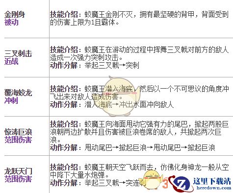 Boss介绍:蛟魔王金刚不灭,防御惊人,百战不败,拥有最坚硬的铠甲,随其到处都是划痕,却毫不影响,喜好水面战斗,拥有乘风破浪之势。