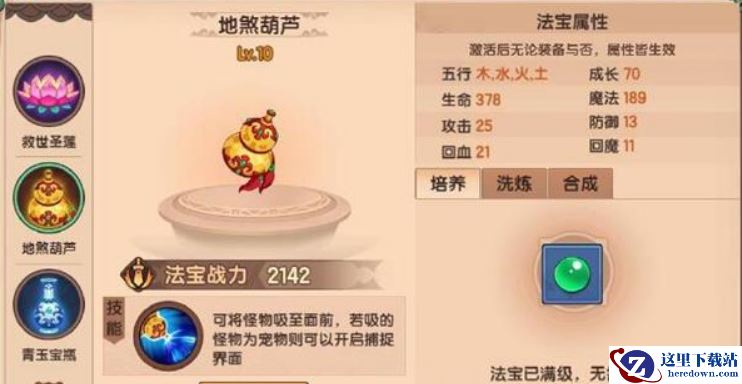 1、地煞葫芦,这个法宝技能是吸怪物,弱化版战争怒吼,这个法宝如果要易爆点刷装备还是很有用的。