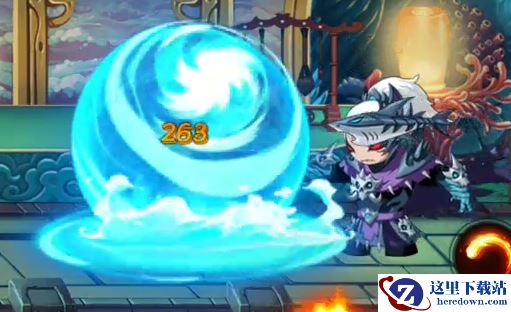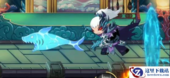 鲨魔王举起手从左(或者右)屏幕外召唤一只水鲨鱼直线快速游向敌人位置对其造成伤害,水鲨鱼出现的高度和敌人所在的高度一致。