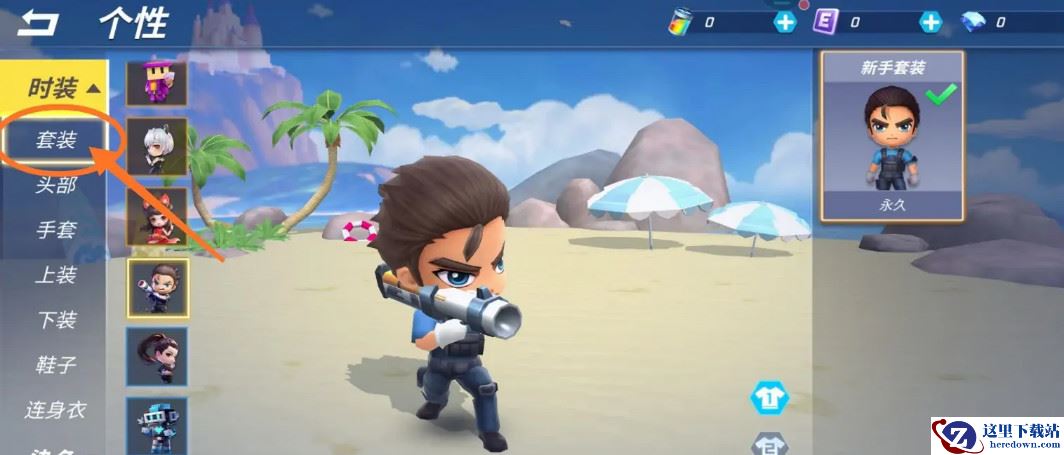 2、进入服装页面,点击左侧的“套装”按钮,如图所示。