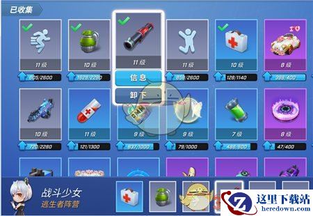 进入道具卡界面后,选择想要更换的道具图标,会激活“卸下”按钮,点击按钮就可以完成卸下道具;