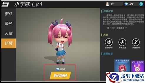 3、进入购买界面,点击下方的购买角色按钮,消耗680钻石后即可获得小学妹啦!